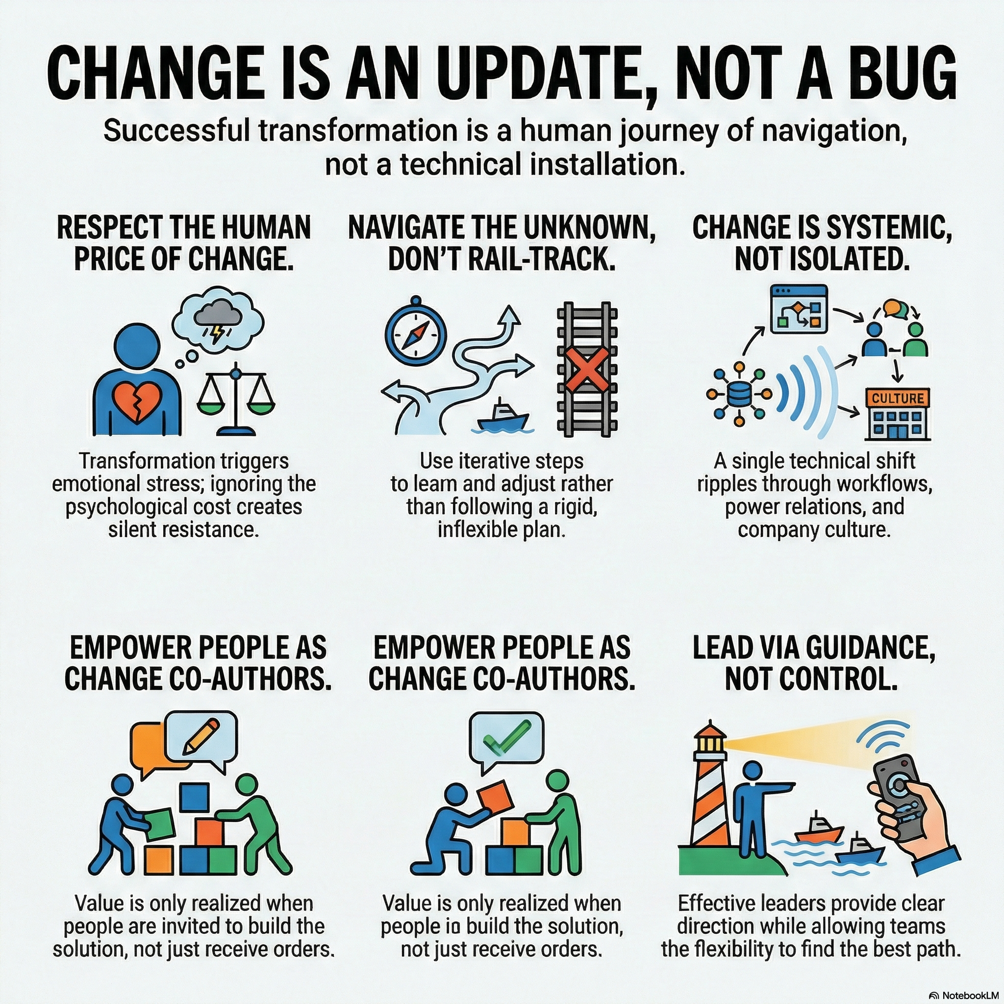 Successful transformation leaders do less engineering and more navigation. They observe, listen, adjust, define principles, and leave space for teams to find the best path within those boundaries. Instead of closed plans, they work with open directions. Instead of rigidity, they work with situational awareness.